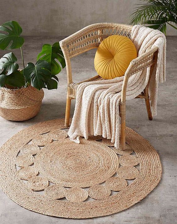 Với họa tiết hình tròn được ví như mặt trời thảm cói họa tiết mặt trời đẹp và sang trọng phù hợp cho khách hàng đam mê decor trang trí không gian phòng ngủ và phòng khách.